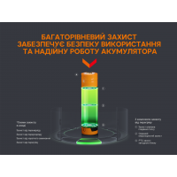 Корпус акумулятора 18650 виготовлений зі сталі, яка знижує ризик вибуху, викликаного ударом у разі падіння. Захисна система вбудована в аксесуар з боку анода. Акумулятор має багатоступеневий захист від перезаряджання, перерозряджання, короткого замикання. Також передбачено захист PTC, який не дає елементу живлення перегрітися. У разі накопичення газу всередині конструкції, він поступово скидається через спеціальні отвори, що дозволяє уникнути здуття корпусу.