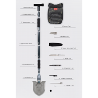 Інструмент виготовлений виключно з якісніх матеріалів, які забезпечують надійність і довговічність виробу. Функціональні насадки, формують держак лопати, виконані з високоміцного алюмінієвого сплаву, а саме робоче полотно — з високовуглецевої сталі. Загальна довжина моделі в робочому стані дорівнює 78.8 см, ширина полотна — 12.8 див.