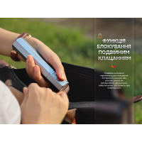Блокування: при розблокованому та вимкненому ліхтарі двічі клацніть перемикач протягом 0,5 секунд, щоб заблокувати модель. Вона двічі блимне в Low режимі, вказуючи, що тепер заблоковано. Розблокування: при заблокованому ліхтарі двічі клацніть кнопку протягом 0,5 секунди, відбудеться розблокування, і ліхтар одразу ввімкнеться у режимі Eco. Під час заряджання ліхтаря він також буде розблокований.