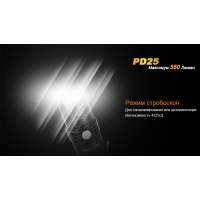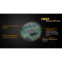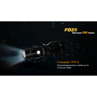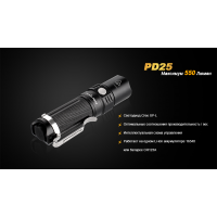 Завдяки невеликим розмірам, ліхтар Fenix PD25 легко поміщається в кишені. А високий рівень міцності дозволяє не турбуватися про його працездатності в заміських умовах. Механізми ліхтаря захищені від перегріву, виникнення короткого замикання. Яскравість світла в обраному режимі підтримується спеціальним драйвером на постійному рівні, а про те, що заряд акумулятора вичерпаний, попередить вбудований індикатор. На механічному рівні модель Fenix PD25 також добре захищена. Корпус для ліхтаря зроблений з металу з анодуванням поверхні, його деталі щільно підігнані один до одного. Fenix PD25 відповідає вимогам, які висуває міжнародний стандарт IPX-8. Він передбачає, що ліхтар не вийде з ладу після падіння з висоти 1 м на камені та продовжує справно працювати після занурення на півгодини на 2 м під воду.