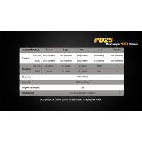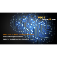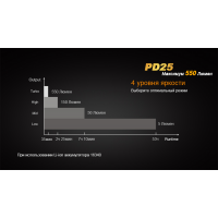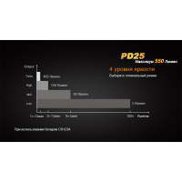 У светосхеме ліхтарі Fenix PD25 використаний сучасний діод американського походження. Це XP-L фірми Cree — провідного виробника потужних, довговічних напівпровідникових джерел світла. Потенціал роботи XP-L Cree становить 50 000 ч. Для підтримання стабільної роботи ліхтаря буде потрібно всього один акумулятор формату 16340. Крім нього можна використовувати такі ж за розміром батарейки CR123A. Робочі параметри ліхтаря декілька розрізняються залежно від того, якого типу елемент живлення вибрав користувач. В результаті тестування на заводі Fenix були визначені наступні параметри для акумулятора: