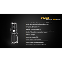 Інструкції по використанню: Fenix PD25 розрахований на роботу з компактними елементами живлення двох типів: CR123A батарейки (літієві), 16340 акумулятори (Li-ion). Батарейний відсік зроблений під один елемент живлення і має маркування, що враховує полярності батареї.