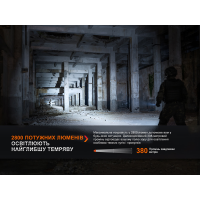 - Турбо: 2800 люмен – 380 метрів – 3 години 30 хвилин;