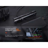 Білий світлодіод Luminus SFT70 генерує яскраве світло далекобійністю 380 метрів. Ресурс роботи діода складає близько 50 тисяч годин. За живлення ліхтаря відповідає Li-ion акумулятор форм-фактора 21700 Fenix ARB-L21 V2.0 ємністю 5000 мАгод. Підзарядка елемента живлення здійснюється за допомогою зарядного кабелю, який під“єднується безпосередньо до корпусу із вбудованим портом USB Type-C. Час заряджання становить 3 години. При необхідності акумулятор із комплекту можна замінити на один із фірмових акумуляторів: ARB-L21-5000U або ARB-L21-4000P.