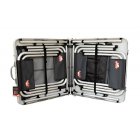Стільці кріпляться до внутрішньої сторони столу, стіл складається навпіл як чемоданчик.