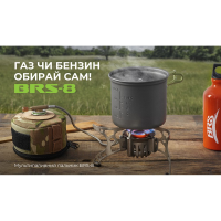 Мультипаливний пальник BRS-8 є портативним пристосуванням для пікніків, туристичної діяльності, різних видів активного відпочинку. Нафтогазове подвійне призначення. Потужність пальника досягає 4500 Вт. Матеріали у складі виробу: сплави алюмінію та міді.