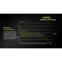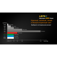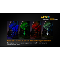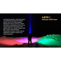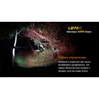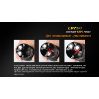 Ліхтар Fenix LD75C виробники забезпечили чотирма потужними світлодіодами Cree XM-L 2 U2, кожен з яких має в своєму розпорядженні запас працездатності в 50 000 ч. Яскравість цих діодів в максимальному режимі становить 4200 люмен. В додаток до них можна включити п“ятий мультицветный діод, який в режимі білого світла додасть ще 200 люмен яскравості. Крім того, цей діод може працювати в режимі червоного світла з яскравістю 140 люмен, забезпечуючи умови для збереження нічного зору. В режимі зеленого світла можлива яскравість 190 люмен, а в режимі синього — 45 люмен. Регулювання яскравості звичайного білого світла, а також переключення інших режимів роботи здійснюється за допомогою трьох кнопок управління, які компактно розміщені в головній частині корпусу ліхтаря.