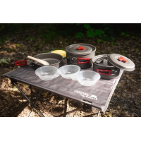 Набір посуду компактних розмірів, призначений для використання в туризмі. Процес приготування їжі на відкритому повітрі буде легким, швидким та приємним. Оптимально для використання невеликою компанією з двох-трьох чоловік. У комплект включені три ємності, ополоник, ложка, губка для миття посуду. Все це дуже зручно для експлуатації в польових умовах. Також передбачений чохол для зберігання і перенесення виробів.