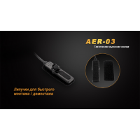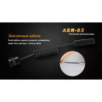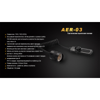 Адаптер накручується на торець ліхтаря замість стандартного хвостовика з кнопкою. Він зроблений з алюмінію, покритого шаром захисного жорсткого анодування. На зворотному боці контактної майданчики, виробники розмістили липучку, за допомогою якої її легко закріпити в потрібному місці. Шнур кнопки Fenix AER-03 — вітою. Він розтягується на довжину від 24 до 80 см в залежності від необхідності. Всі елементи кнопки добре захищені від попадання всередину води. Таким чином, аксесуар відповідає нормативам стандарту IPX-8.